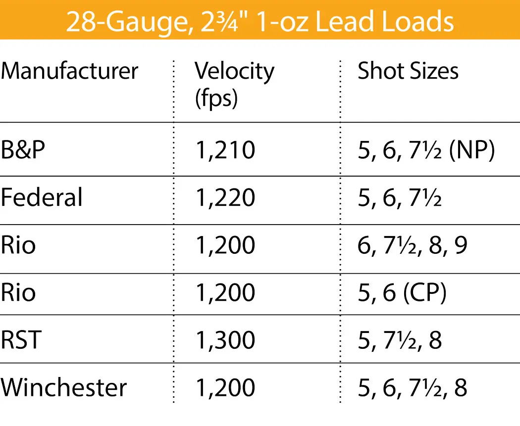 A thorough perusal of shotshell manufacturers’ catalogs (current at press time) reveals that there are now six 1-oz, 28-gauge factory lead loads available to US shooters. This is impressive, given that for at least 15 years only Winchester marketed a 1-oz, 28-gauge lead load in the US. Within the past four years RST has jumped in with a 1-oz, 28-gauge load at a speedy 1,300 fps, and B&P and Rio have, as well, though with velocities hovering around 1,200 fps. The most recent introductions were by Federal (1,220 fps) in early 2017 and another by Rio in October 2017 (1,200 fps).