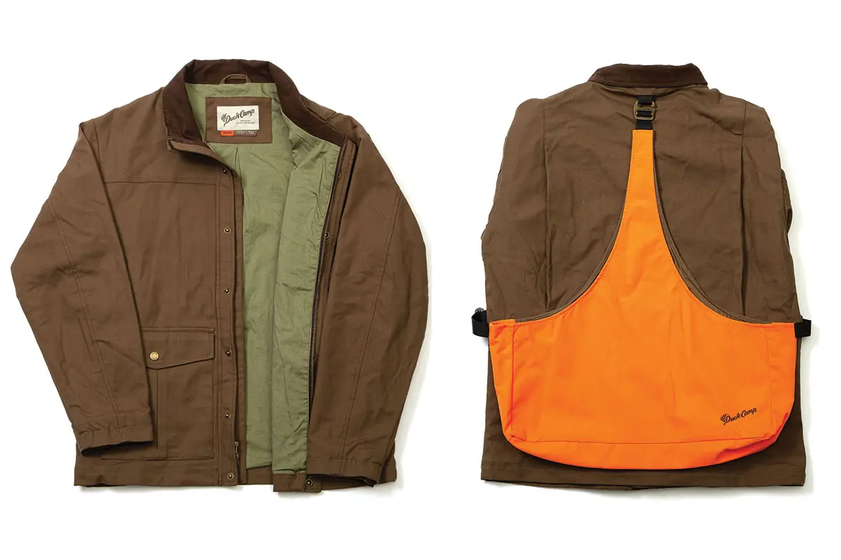 Made of two-way-stretch Cordura and lined with soft cotton, Duck Camp’s Brush Jacket has rugged good looks and the field functionality to match. The durable, water-repellent canvas outer repels brush and moisture and offers warm, stylish comfort. The jacket has a zippered front and storm flap with brass, quiet-snap buttons; large front bellows pockets for shells; and fleece-lined handwarmer pockets. Especially nice is the rear game bag, which not only is reversible—from orange to brown—but also is removable for street wear. Other touches include triple-stitched construction, a moleskin collar, wool storm cuffs, and interior and exterior security pockets. The jacket fits well and offers plenty of flexibility for a smooth gun mount. Color: Brown. Sizes: S through XXXL. Price: $249.
