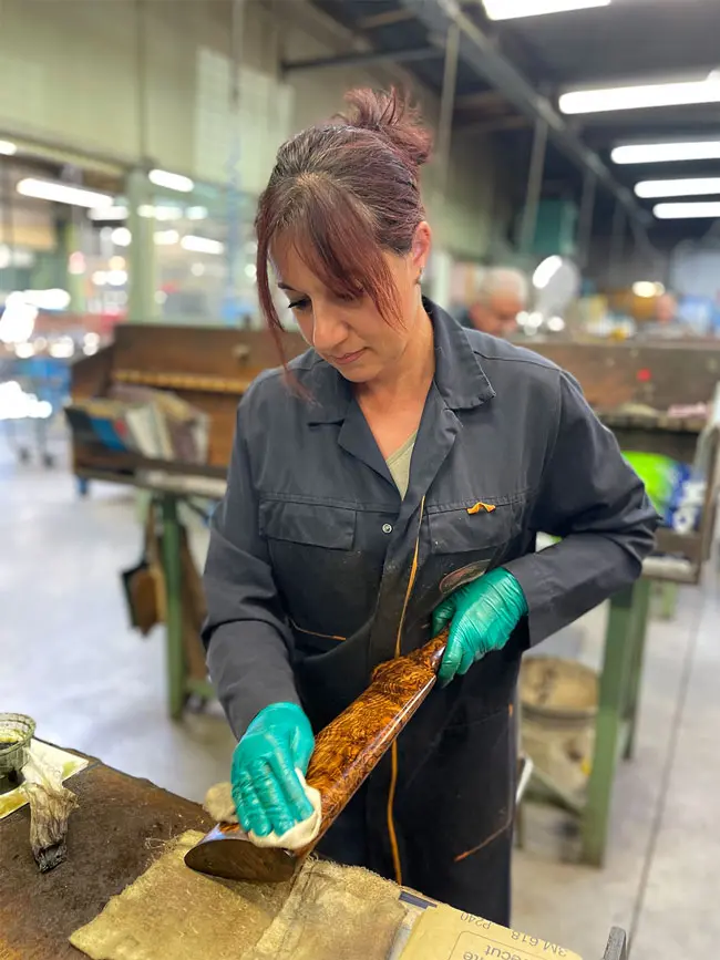 The 1980s-influenced building belies the company’s commitment to pragmatic yet inspired craftsmanship. Natural light streams through large skylights, filling the space with a sense of inspiration. Other than some of the engravers working out of their home studios, the 64,500-square-foot factory is a complete gunmaking operation. Every process of building the company’s double shotguns and rifles, ROLS (Rifle Opening and Locking Straight) bolt-action rifles and Manurhin revolvers is completed here. (Chapuis acquired Manurhin in 1994, and the pistol is now marketed in the US through Beretta USA.) Fifty-four men and women are employed at the timeless workbenches welding and soldering, shaping and checkering, and fitting and finishing the guns. This is not to say that the factory is some luddite’s fantasy, as computer-driven processes are thoughtfully applied in melding century-old sensibilities with cutting-edge technology.