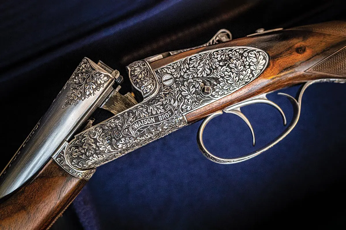 “What kicked all this off really is my fascination with pigeon guns,” he said. “Ask me my favorite? It has to be a Purdey pigeon gun built anytime from the mid-’20s to the mid-’50s. I have one in at the moment with 32-inch barrels and an elevated ventilated rib.” The Watson Brothers 28 features many of the elements we associate with the pigeon ring, from a beavertail forend to a pistol grip, sideclips and a wide flat-top rib. It also has the Louca signature coffin-shaped round-body action and Martin Smith’s oak-leaf carving straddling the action and extending down the 29½” Full-choked barrels. It is priced at £65,000 (about $75,000).