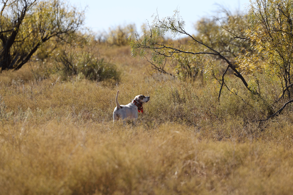 Reid and I soon piled into a generously sized Can-Am UTV with Matt and guide Mike Stevenson. Mike, who hailed from Mississippi, would be the lead guide on our two-day hunt. Within minutes of passing over the cattle guards, we were on a slowly warming hillside watching Mike carefully wrap the paws of his diverse kennel of pointers, English setters, Brittanys and English cockers. Protecting his athletic and carefully trained gundogs was a science in itself, as the harsh Texas terrain and hardened ground could absolutely tear up dogs’ feet. Instead of using expensive boots that could be easily lost or destroyed, Mike and the other guides first wrapped each foot with gauze; then layered over it a basic, custom-designed duct-tape pad that folded to cover the top and bottom of the paw; then secured everything with more duct tape.