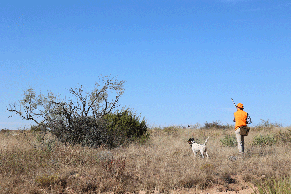 On our early-season trip we hunted the 22,000-acre Spur Ranch, which lies roughly an hour east of Lubbock and 90 minutes northwest of Abilene and is one of six ranches that comprise Guitar Ranches. The carefully kept property sits where West Texas’ High Plains region transitions to the state’s Rolling Plains. The ranch has a ring of five log-cabin-style cottages, two bunkhouses and a family-style cook shack that are an oasis of Western-style comfort. Together they are a public-facing slice of the family’s 150,000 acres accumulated over decades to support cattle, cotton and now hunting. Today Spur Ranch hosts bird, deer and wild-hog hunters on lands pierced by cedar-flanked slopes and graceful slot canyons shaped in sandstone by millennia of downpours. The grounds hold an incalculable number of wild bobwhites mixed with blue (scaled) quail—all sharing the same land and providing a pleasant surprise with every covey. Points on the well-managed ranch can produce either bobwhites or blue quail. Guides use a variety of pointing dogs to find birds and English cockers to do the retrieving.
