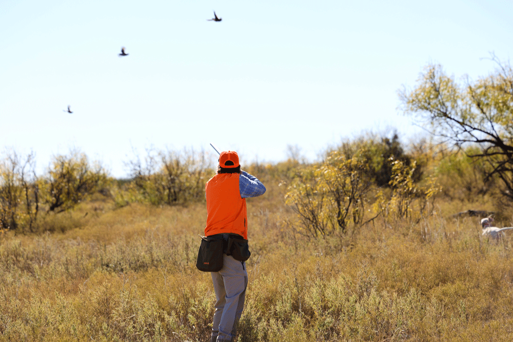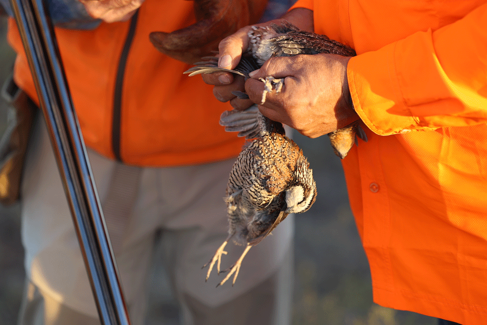 Once the taping was complete, a brace of dogs was set loose. They crisscrossed the rugged earth as we trailed behind comfortably in the UTV. Within 15 minutes they went on point, and I quickly flanked my first covey of wild quail. As I scanned the ground for any sign of movement or color, the air suddenly filled with a covey of eight or so birds. Due to my untrained shooting method, the bobs escaped simply by scrambling my consciousness. Time and time again this proved a formidable defense. It didn’t work on Reid, though, as he immediately started dropping birds. He had three in the bag before I connected with my first.